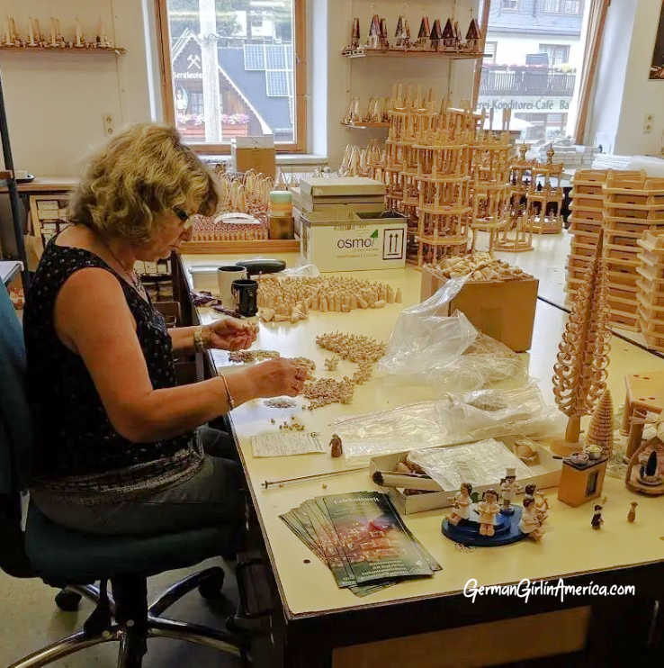 For a more “hands on” experience, go up the hill to visit the Schauwerkstatt.In fact, if you don’t have time to visit any other workshops, go here. The workshop and store are right at the entrance to Seiffen with a big moving Pyramid out in front. Inside you will find work stations where you can watch craftspeople make the most marvelous wooden decorations. The rooms show all of the bits and pieces that go together to make the German Christmas decorations.