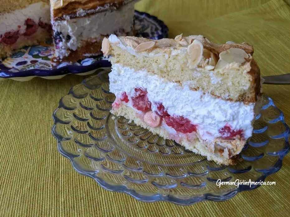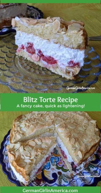 The Blitz Torte recipe came to me from my Tante Anne. It looks impressive, but despite looking “fancy,” it’s actually not that difficult to make. Sweet, tart fruit and a whipped cream filling are sandwiched between two layers of cake topped with meringue and almonds. It’s perfect for a Kaffeeklatsch. And it certainly lives up to its name—it’s LIGHTENING FAST to make!