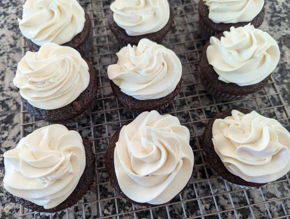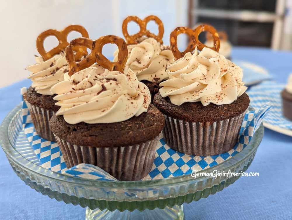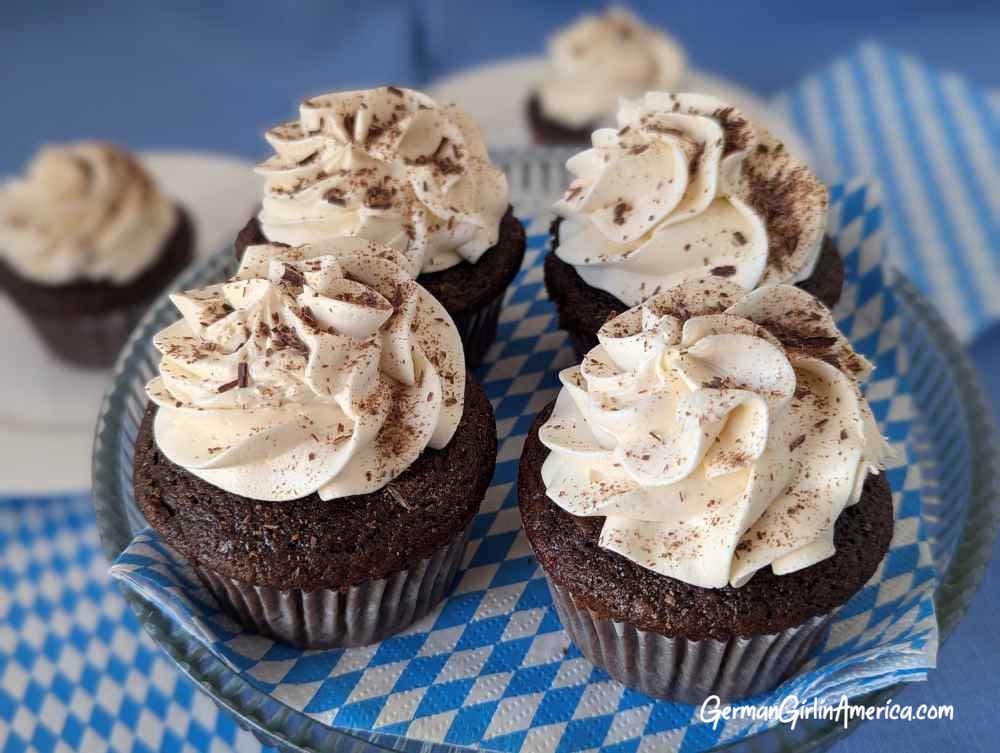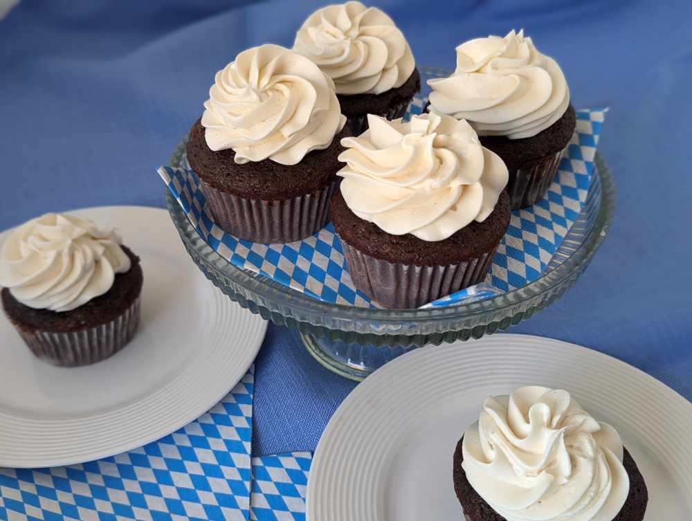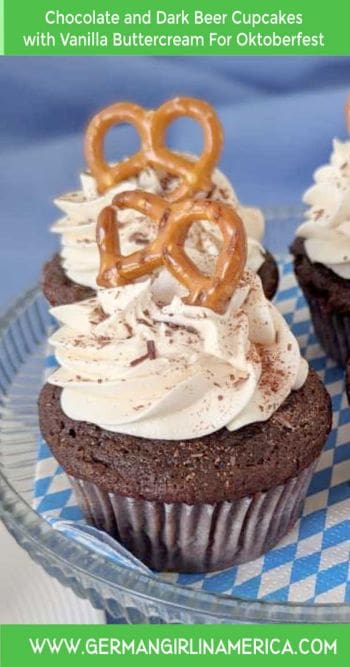 I know, I know… Chocolate and Dark Beer Cupcakes with Vanilla Buttercream are not STRICTLY German. (Or really, traditional German at all) BUT! They are tasty. And since I used a dark Erdinger Weissbier German Beer, these delicious treats count as Denglish. The recipe comes from one I used to bake for Irish friends using Stout beer (Guinness). I find that German beer gives a great result, even enhancing the chocolate flavor. And because this recipe came from my old handwritten cookbook, the measurements are in cups and ounces.