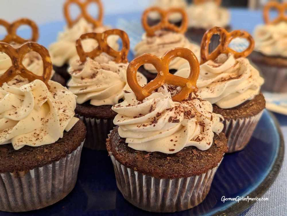 - Frost the cooled cupcakes with a spreader or knifeIf you have a pastry bag (or ziplock gallon bag) with a tip, you can pipe a swirl on the cupcakesSprinkle over some shaved chocolateTop with a pretzel (optional)