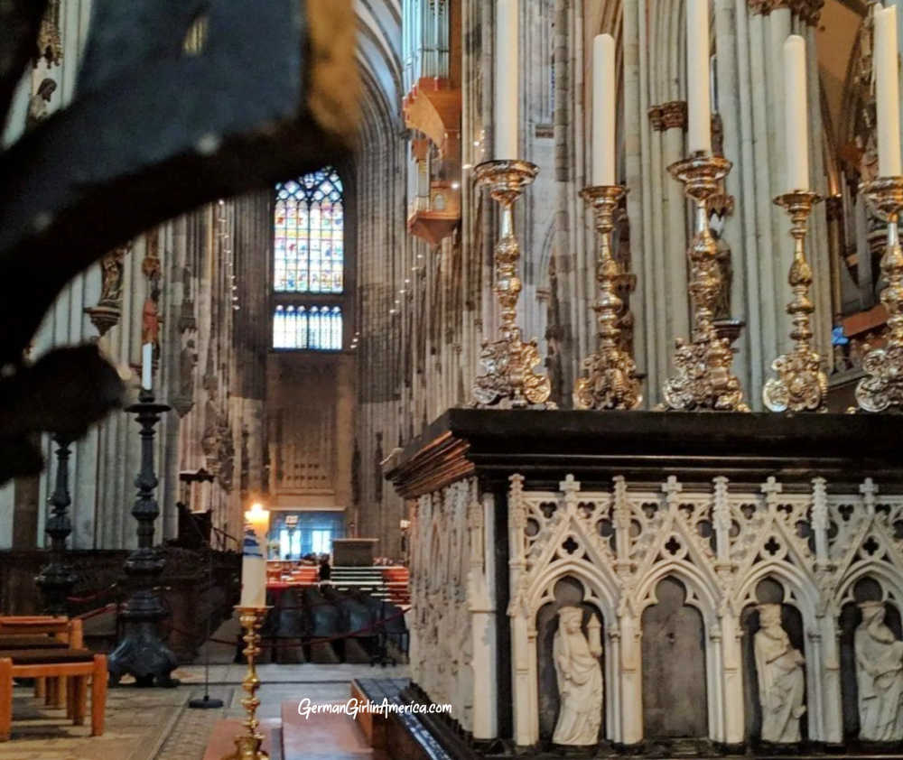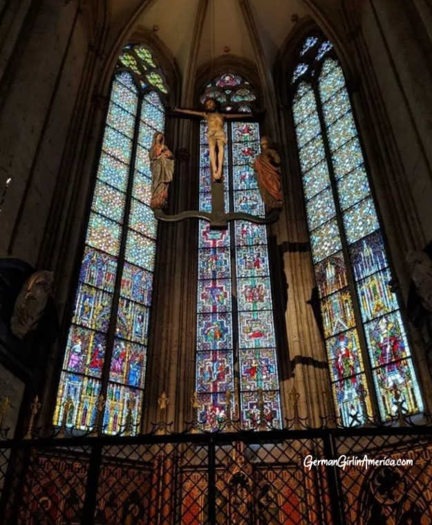 Behind the Altar, you will find the oldest stained glass windows in the Cologne Cathedral, dating back to the 13th century. Look carefully. Each panel has a story from the Bible. On the right, you will find stories from the New Testament, and on the left, a matching story from the Old Testament. (For example, the birth of Jesus is next to the birth of Isaac). Side note- Since the Cologne Cathedral in Germany sits close to the Cologne HBH (Main Train Station), which was a prime bombing target, these windows were carefully removed, packed up, and stored during WWII to keep them out of the blast zone.