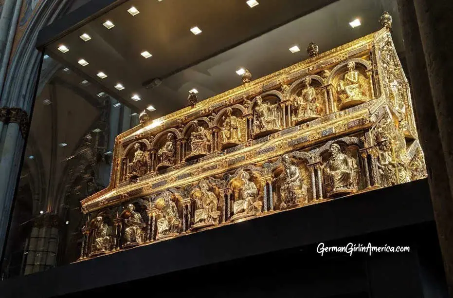When you are ready, head downstairs to the Treasury. (Be aware there is an added charge of around 3 Euros for visiting these rooms.) The Cologne Dom Treasury is one of the largest in Germany despite having been robbed a few times. (This is why it’s now underground.) In it, you will find gold chalices, historical garments, and relics from other saints. Also, art, illuminated manuscripts, and even a shrine holding three links from St Peter’s chain.