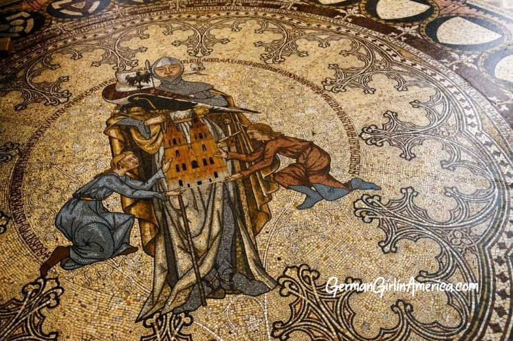 The mosaic floors have fabulous detail. The tiny 1 cm square tiles unbelievably cover the most cathedral floor (1350 square meters or 14,500+ square feet) with beautiful images, including the Archbishop Hildebold with a model of the old Cathedral, the coat of arms from various Bishops and archbishops, flowers, and more. The floor, made by Villeroy & Boch, the famous porcelain maker, took 14 years to install. And most people walk right over it. Do yourself a favor, stop, get close to it, and really look.