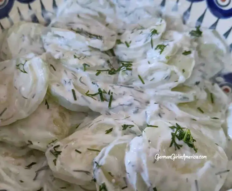 My mother and my Oma came from different corners of Germany, so naturally, each has a different recipe for cucumber salad. Oma passed along this Creamy German Cucumber Salad recipe. From Mom, I got the German Cucumber Salad recipe that uses an oil and vinegar base (find the recipe here). While both are quite tasty, this creamy version is the one that more people seem to recognize.