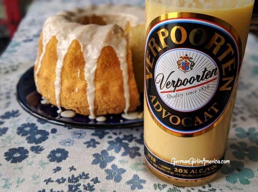 Eierlikör is an alcoholic Beverage made from egg yolks, sugar, and brandy. Think of it as a very thick Eggnog without nutmeg. And it’s not all that difficult to make. Follow this link to my recipe-> How to make Eierlikör. (Note that my recipe uses raw egg yolks, so it’s fine for baking, but unless you know your egg source, it’s not suitable for drinking.)