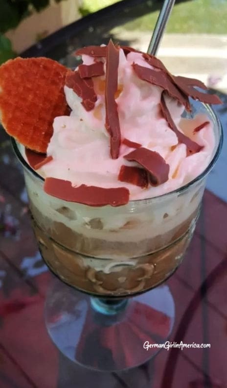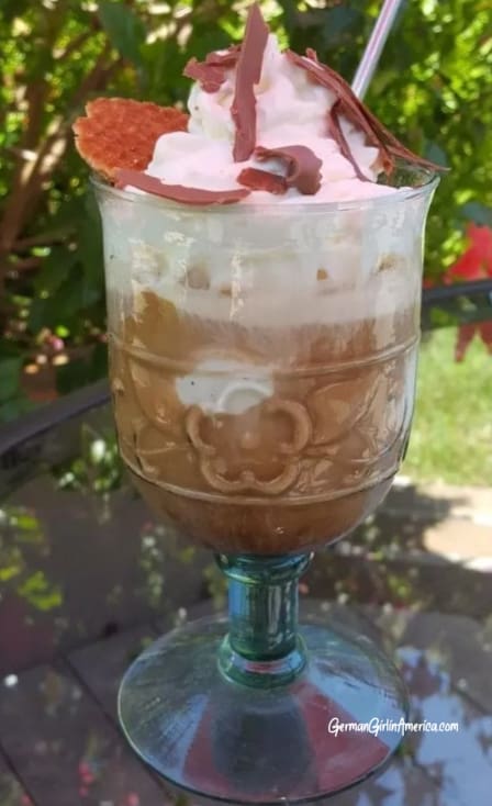 A German Eiskaffee is a tasty way to beat the heat! This delightful treat is found in every Eisdiele (Ice Cream Shop) across Germany, and I guarantee that on a warm Saturday or Sunday afternoon, you will find loads of folks sitting under shade umbrellas, sucking up this tasty drink/dessert. Eiskaffee might seem like Iced Coffee, but it’s different. It’s richer and more dessert-like than a simple cup of coffee with ice. Luckily, it’s SUPER easy to make this Eiskaffee Recipe at home. All you need is coffee, ice cream, whipped cream, and some chocolate.