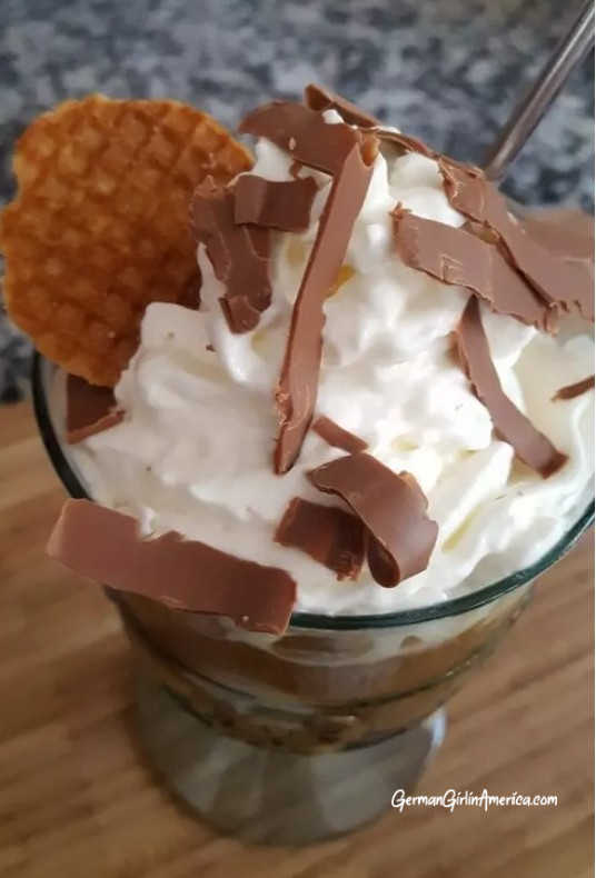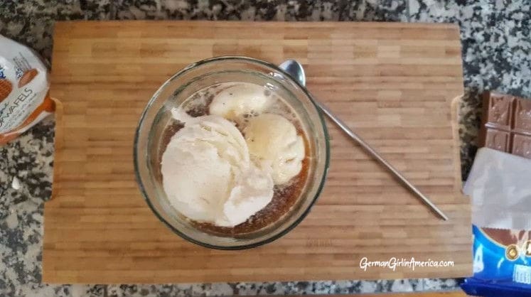 Honestly, this recipe is dead easy to make. The “fancy” is in the details. Use strong German Coffee, high-quality vanilla ice cream, and smooth German chocolate to make your chocolate curls. To gild the lily, provide a crisp waffle cookie for some crunch.