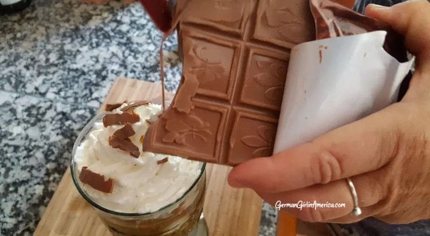 Chocolate Shavings (use a decent chocolate.) I find that the easiest way to do this is to open a new chocolate bar, then shave the end with a potato peeler OVER THE EISKAFFEE (If you do it over a plate, you will have to pick up the shavings, and they will get melty).