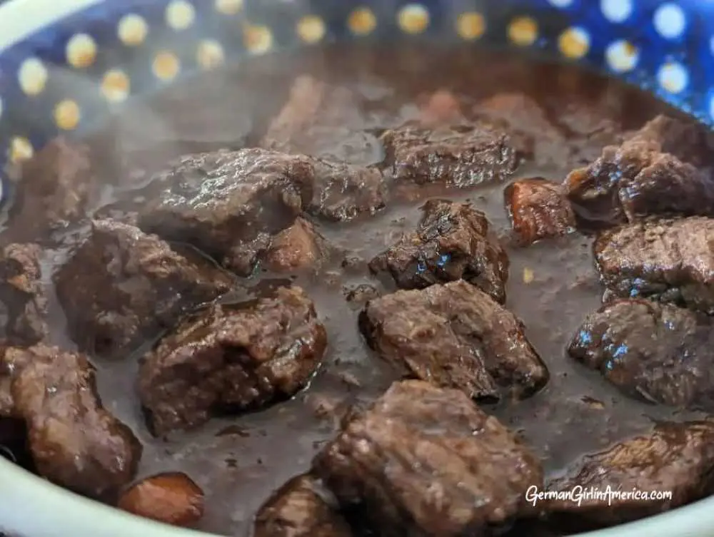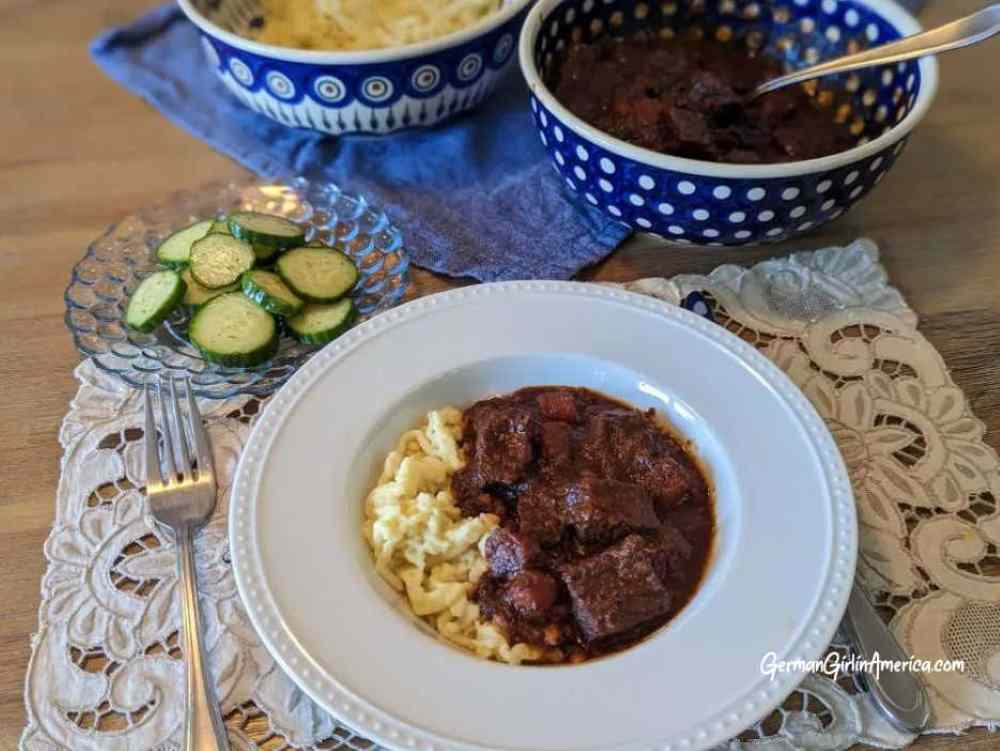 Goulash is a family favorite. Why not? My mom’s recipe tastes delicious. Warm and flavorful, it’s a delicious love letter from the kitchen. It’s a tasty family dinner, and it’s “nice” enough for company. When served over everyone’s favorite homemade Spätzle, Goulash is a crowd pleaser. I can hear it now, “Goulash isn’t German, it’s Hungarian”. Well, I’m sure that at one point, the concept of cooking pieces of meat in a sauce flavored with paprika floated west from Hungary to Germany. Still, that time was very long ago, and now you’ll find Goulash with all of its variations (Wild, Pork, and even Würstchen!) on restaurant menus and dinner tables across Germany.