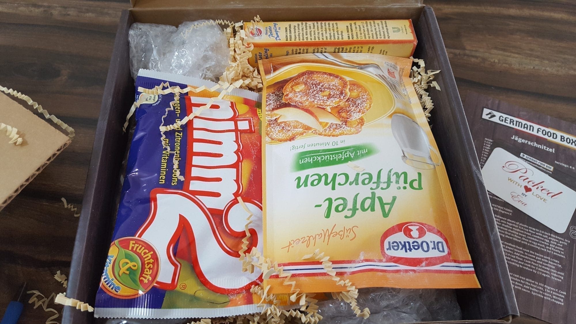 The box came neatly packed in a box that clearly said German Food box, so you could stick a bow on it if you wanted to give it as a gift in person. The person who packed the box included their card. All the fragile items were wrapped in bubble wrap, and the space in the box was filled with shredded paper. You also get a recipe card to try something new outside the box.