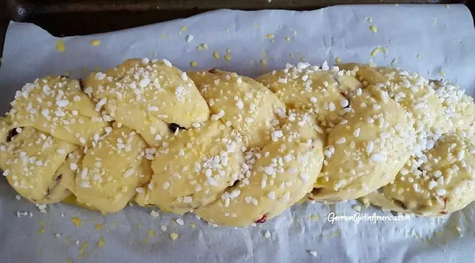 Brush the risen braid with a egg yolk/milk wash… then sprinkle with Hagel Zucker/Pearl Zucker or Sliced Almonds