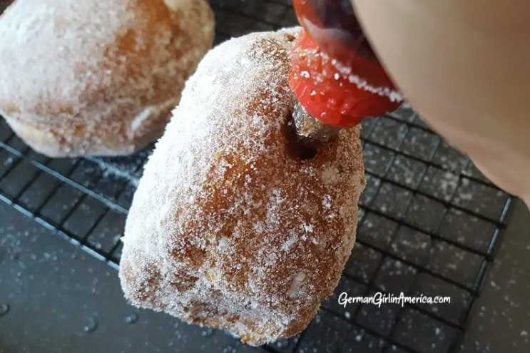 - Poke into the mostly cooled off Berliner on one side, and carefully squeeze to get the filling inside. You might have to move the tip of the bag around a bit.
