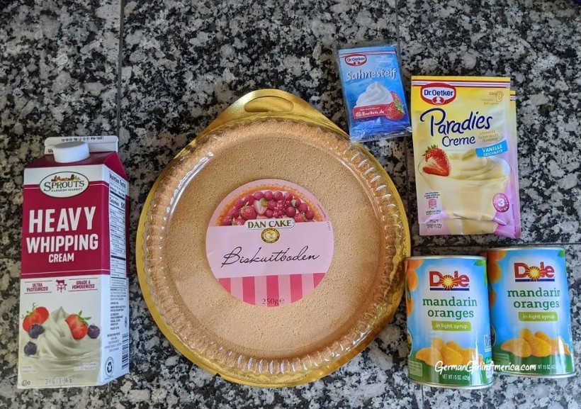 GermanShop24 sometimes sends me products to test and highlight. This month, they sent a Mandarin Orange Cream Cake Recipe called a Schüttelkuchen along with all the ingredients. Schüttelkuchen translates to “Shake Cake.” The method for making it is so different from anything I’ve made before; it seemed to be too easy to actually work.