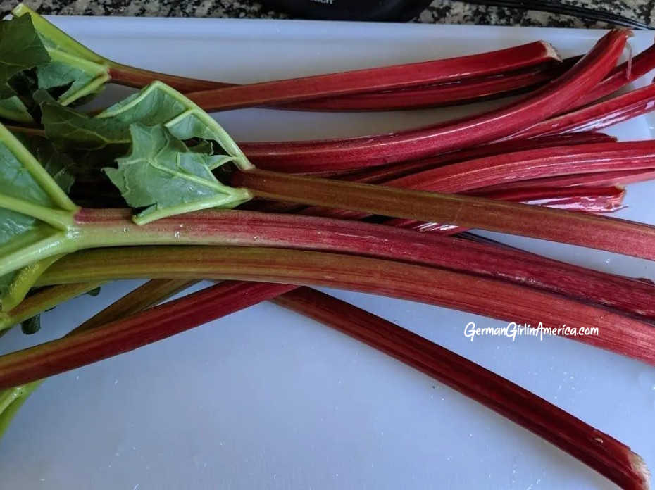 Biggest difference between Germany and America? Most of the time when I buy Rhubarb in my corner of America, the checker has no idea what it is, or what to do with it. (No, it’s not celery. No, you don’t just bite into the stalks. And NO! do not eat the leaves).