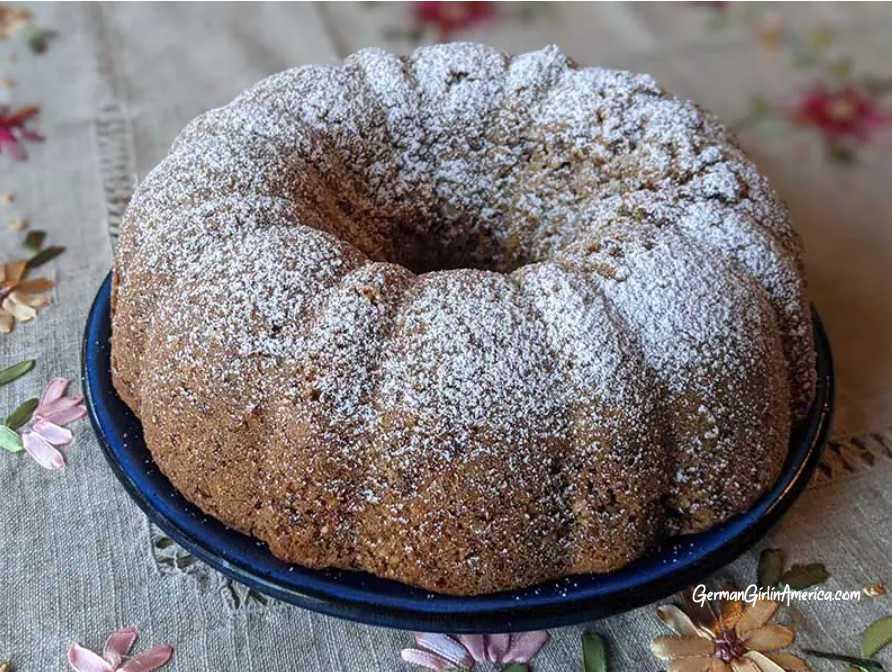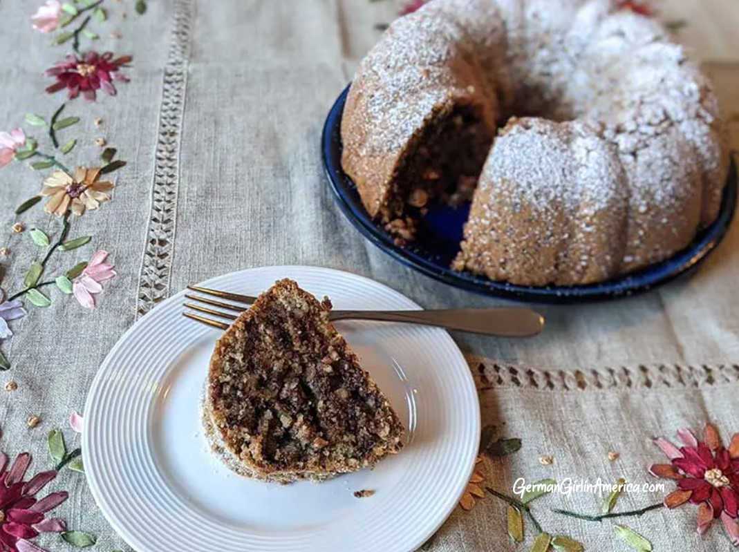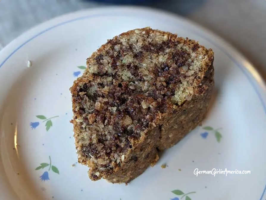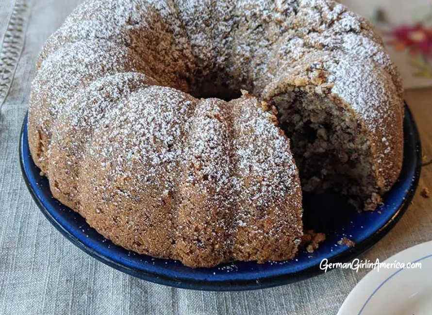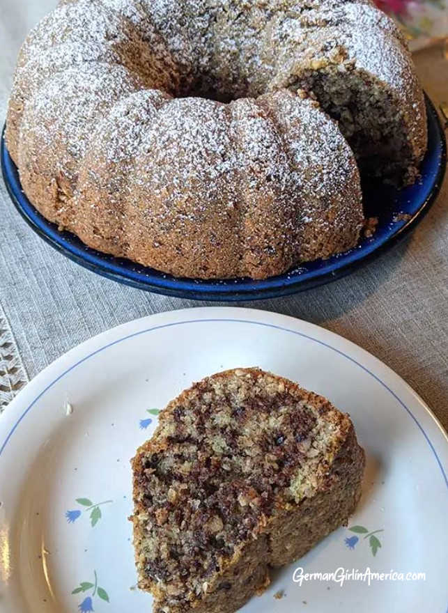 I sprinkle powdered sugar over the top to “decorate” because that’s what Oma did. For even coverage, spoon the powdered sugar into a sieve and shake the sieve over the cake. Want to dress it up a bit? Try drizzling the Schoko-Nusskuchen with a chocolate glaze and sprinkle with a few chopped nuts.