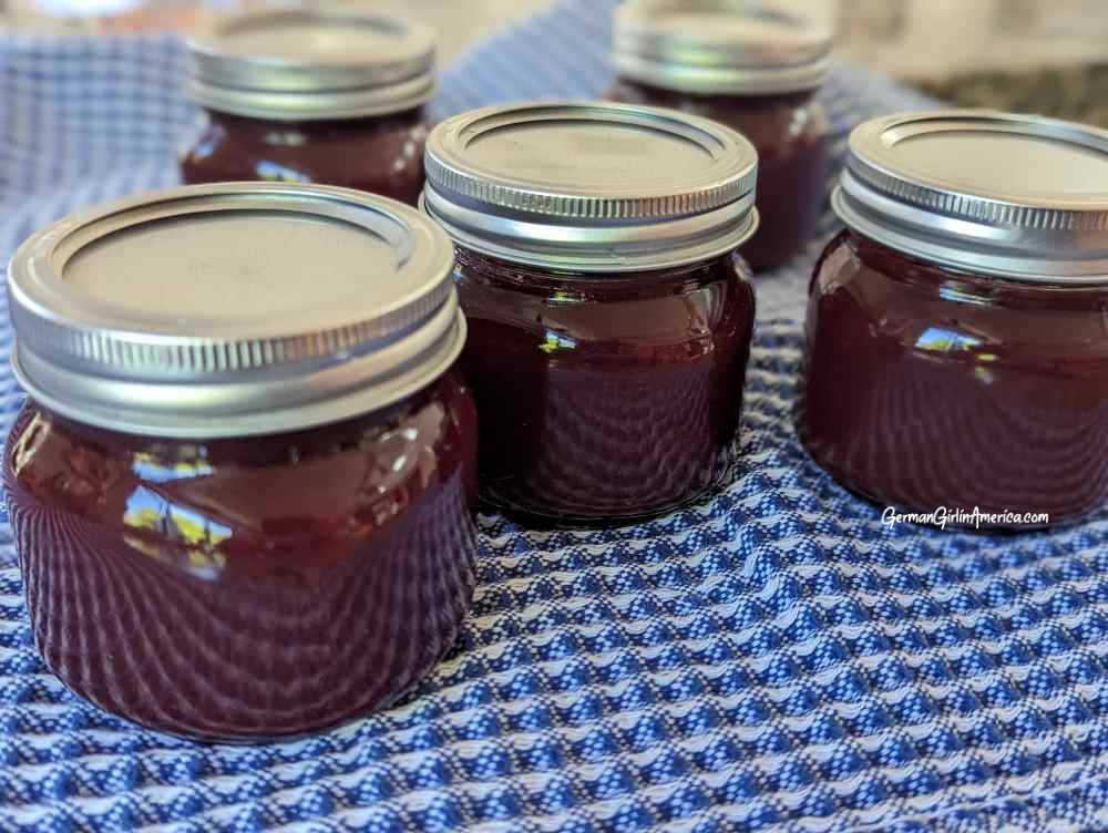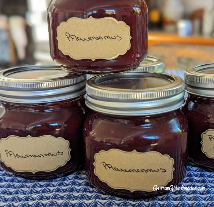 - Ladle the Pflaumenmus into the prepared jars. Wipe the rims with a clean cloth. Put on the lid tight, and then let set the jar upside down to cool. (This should help seal the jar).