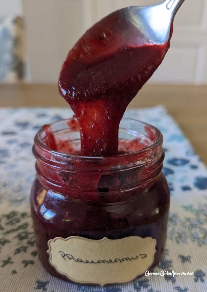 My husband followed his nose into the kitchen. “WOW! That smells so good!”. The whole house smelled of cooking fruit, a little spice, and a lot of yumminess. Move over, Pumpkin spice, the smell of Pflaumenmus cooking is amazing! I love Pflaumenmus. Thick and flavorful, tart with a hint of spice from cloves, and a deep purple color that makes it as beautiful as it is delicious. Although it’s common on the German breakfast table and as a tasty filling for Berliner and certain cakes, you generally don’t find the American equivalent, Plum Butter, in the grocery store. As a child, my mother would carefully pack precious jars in our luggage or make an expensive purchase from a German Grocery Store. This Pflaumenmus Recipe means no more worries about broken jars in suitcases, and I can enjoy this treat as often as I like without fear of running out!
