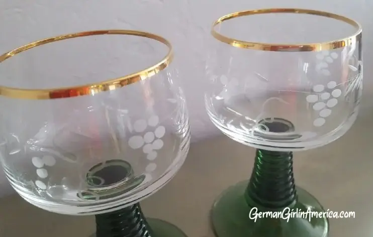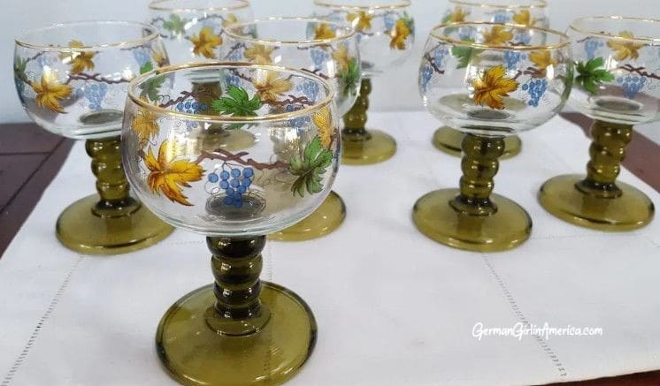What is Roemer Glass? These traditional German wine glasses with green stems are used to serve delicious wines from the Rhine or Moselle regions. We had a set in our home while I was growing up, and my family in Germany has them. I’d bet that most German families have a set in the Schrank. I even have a few sets myself! But what makes these glasses special? Why are the stems of the glasses green? And why are they named for Romans?