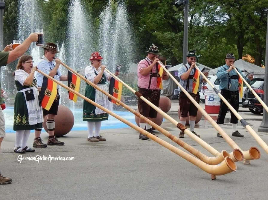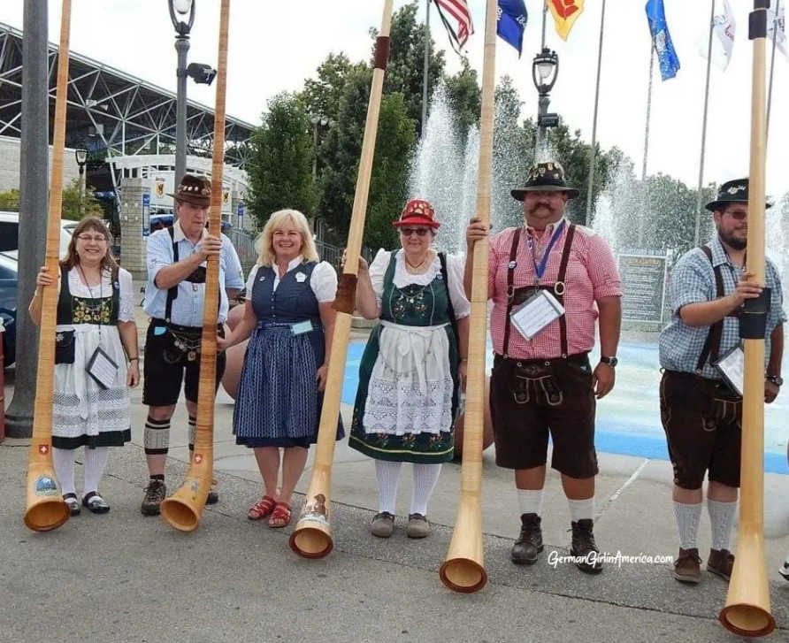 A massive crowd gathered near the Welcome Gates of German Fest in Milwaukee to see The Alpine Echoes perform. It’s not every day you see a half dozen Alpenhorn players playing real music! I’m sure it was the first time many people even heard the Alp Horn outside of a Ricola Ad! (You can hear it in your mind now, can’t you? RIIII Cola!) The Alpine Echos were everywhere over the weekend- at the gates, in the parade, and playing in the opening ceremony with the Freistadt Alte Kameraden Band. And everywhere they went, those long horns drew a crowd. Luckily, I got a chance to talk to them one evening and found out there is much more to the Alp Horn than cough drops.