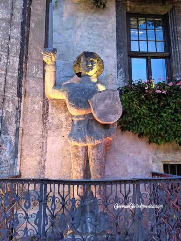 Halle’s Roland is the oldest Roland Statue, dating back to the mid-13th century. Originally made from wood, he was recreated in Sandstone in the 1700s. This 4-meter-tall Roland has been locked away, moved, and restored a few times more often than any other Roland. Most recently, he was saved from WWII bombing by being bunkered behind a concrete slab. What makes this Roland unusual is his outfit- he’s dressed as a pilgrim, complete with an alms bag at his waist.