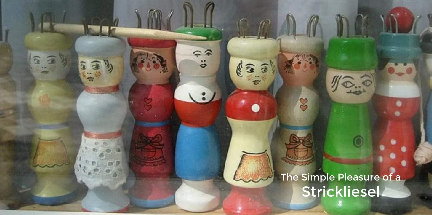 Years ago, German girls were introduced to the all-important (and not always loved) concept of Handarbeit with a Strickliesel. (Handarbeit literally means handwork or handicraft, but in this instance, it means needlework/sewing or embroidery). What is a Strickliesel? These sweetly painted spool looms taught the basics of knitting by turning a simple piece of yarn into a knitted cord. Luckily, these adorable looms were fun to use. And you can’t imagine the thrill I got from seeing the cord emerging from the end of my Strickliesel!