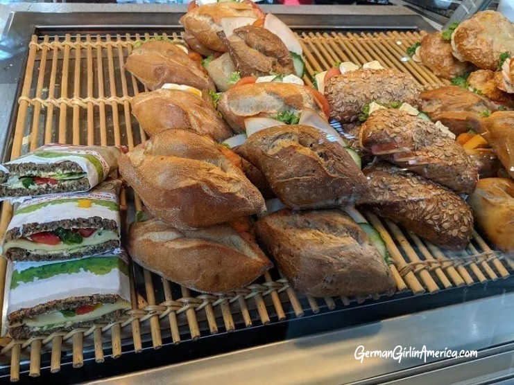 If you are looking for a quick and yummy something to eat, you can usually find sandwiches and other quick stuff at a train station. So many people buy there, that the selection is usually varied, and fresh.