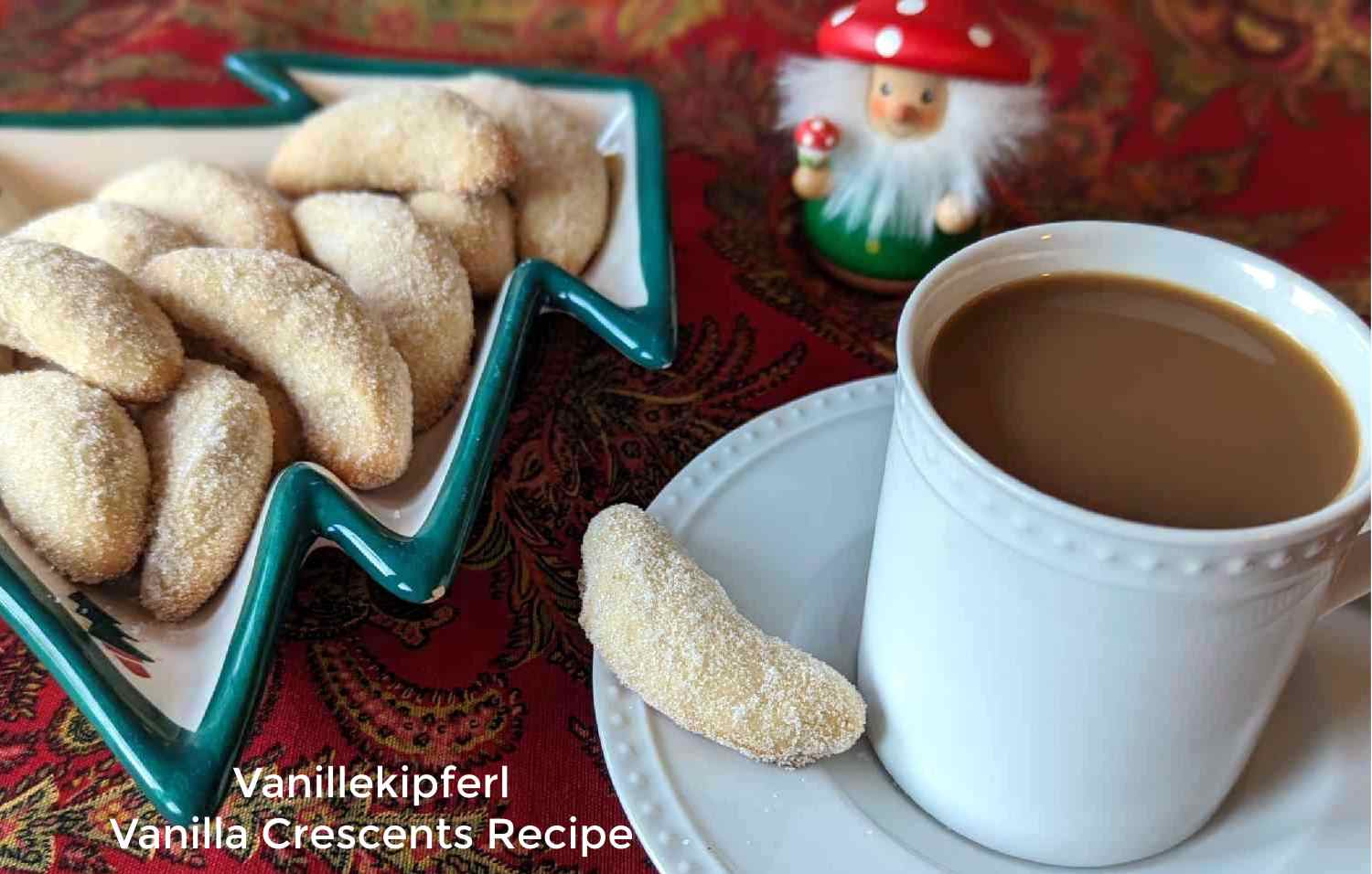 Vanillakipferl or Vanilla Crescents generally aren’t the first cookie people think of when searching for a traditional German Christmas cookie recipe. It’s not spiced like a Lebkuchen or topped jam like Spitzbuben. Instead, the recipe is an excellent example of how a few simple ingredients can come together to make flavorful magic. These rich and delicious cookies are made from ground almonds and A LOT of butter (they really are quite short), then flavored with vanilla and a coating of vanilla sugar. Maybe they don’t shout Christmas, but they fit perfectly on your Bunter Teller. And in my house, they are the first to vanish.