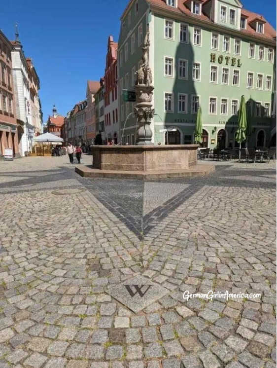 The Fountain in the Obermarkt with cardinal directions set in the ground to indicate the Via Regia, and the North South trade routes.