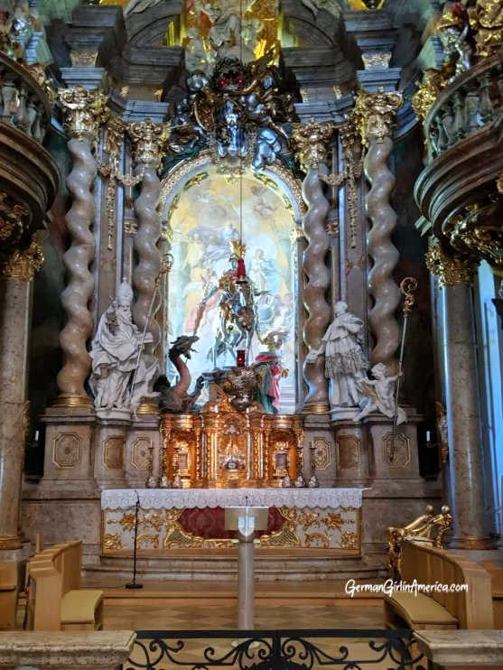 He also added an apse (the end of the church for clergy) on the east end to get more dramatic space for the altar. Then Cosmas brought in his sculptor brother Egid Quiri Asam to build massive sculpture of St Georg slaying a dragon, which dominates the space.