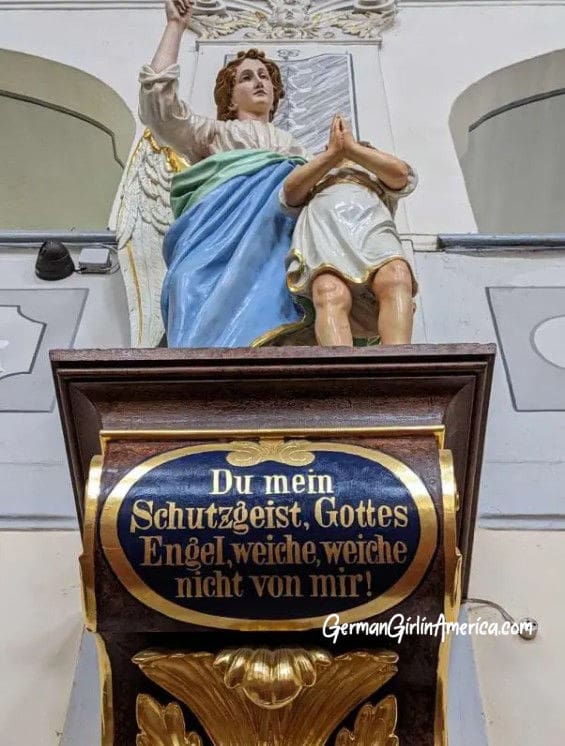 A German Schutzengel in Poland- We found this Schutzengel while visiting Stronie Slaskie, the town my mother was born in when it was still called Schreckendorf in Silesia. This German inscription in the Catholic church on the hill is one of the few reminders that the town used to be German.