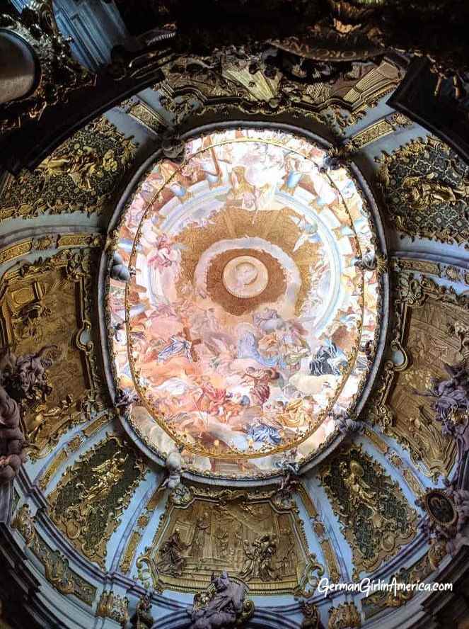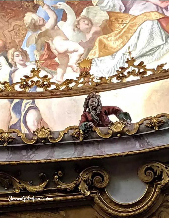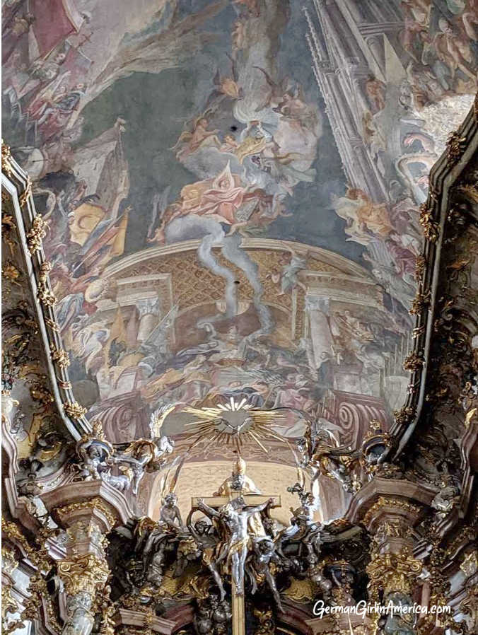 After their training, it was logical that the brothers return to the family business in Germany. They used their connections and started working in Bavaria. So many churches still needed to be repaired or built. But it was their work at the Klosterkirche Weltenburg that made them famous. Today, most people go to Weltenburg for the beer, which is quite good, but inside the church, you find one of the most important works of Baroque art in Europe. Breathtaking, overwhelming, amazing! Between 1716 and 1739, the Asam brothers built and decorated the church in their recognizable style. The altarpiece, with its backlit St. George, dominates the room. But stop and look up. The ceiling is covered in a beautiful fresco (and yes, that’s a sculpture of Cosmas waving at you from above the altar.) This oval masterpiece gives you the feeling of being in paradise.