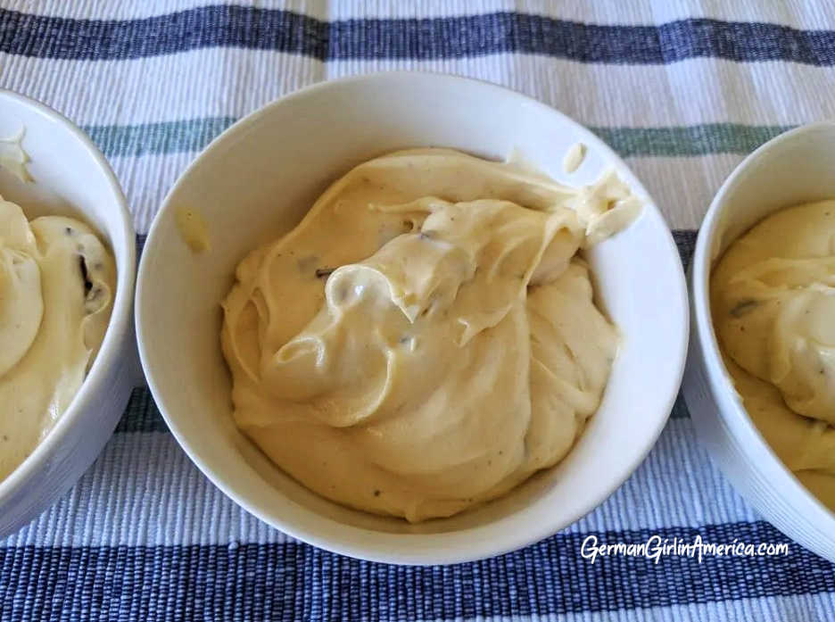 My Oma always served Nachtisch after the Mittagsessen. Remember, that’s the bigger warm meal in Germany. My cousins and I would crowd back onto the Eckbank, excited to see what was coming through the swinging door to the kitchen. Oma would bring two or three large glass serving bowls to the table, and we would help ourselves by scooping pudding or Quarkspeise into the leaf-patterned Glasschälchen. Well, except for my oldest cousin. Oma always made him his own serving bowl full, because he had a big appetite. He was also a slow eater, so we’d all glare at him for having so much all to himself AND taking forever to eat it. (To this day, he’s still a slow eater who savors his food, and he’s thin as a rail. Maybe he’s on to something.) Chocolate Pudding with a pitcher of Vanilla Sauce, Quarkspeise with Cherry Sauce on top, Opa’s FAVORITE Herrencreme, and Apfelmuss made from apples from her trees. Something sweet and not too heavy to round off the meal.