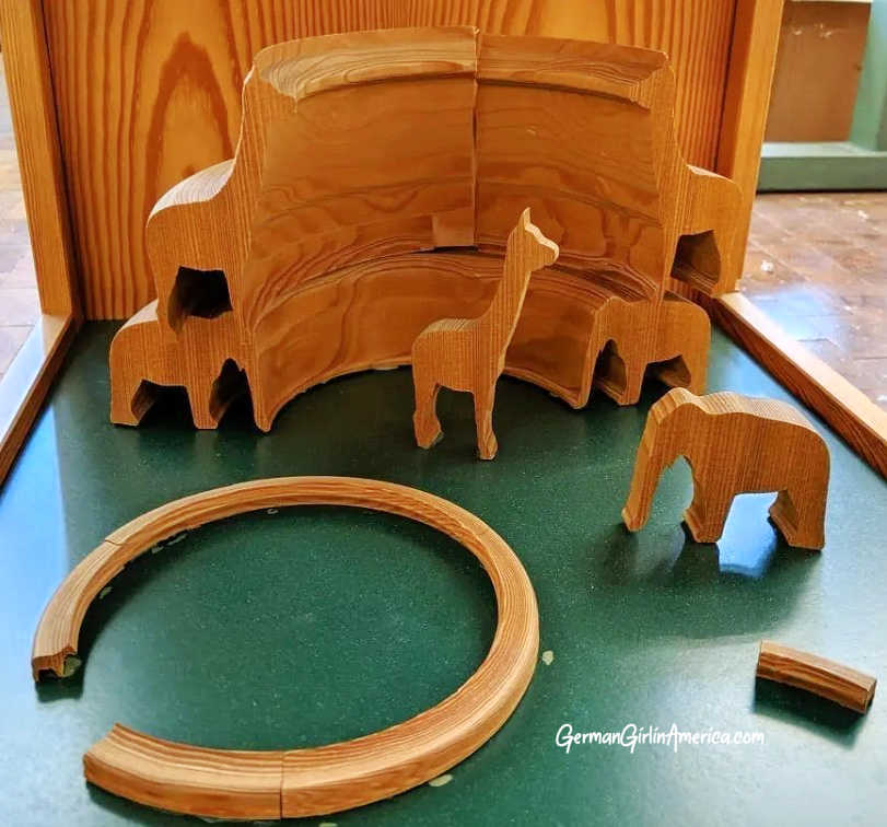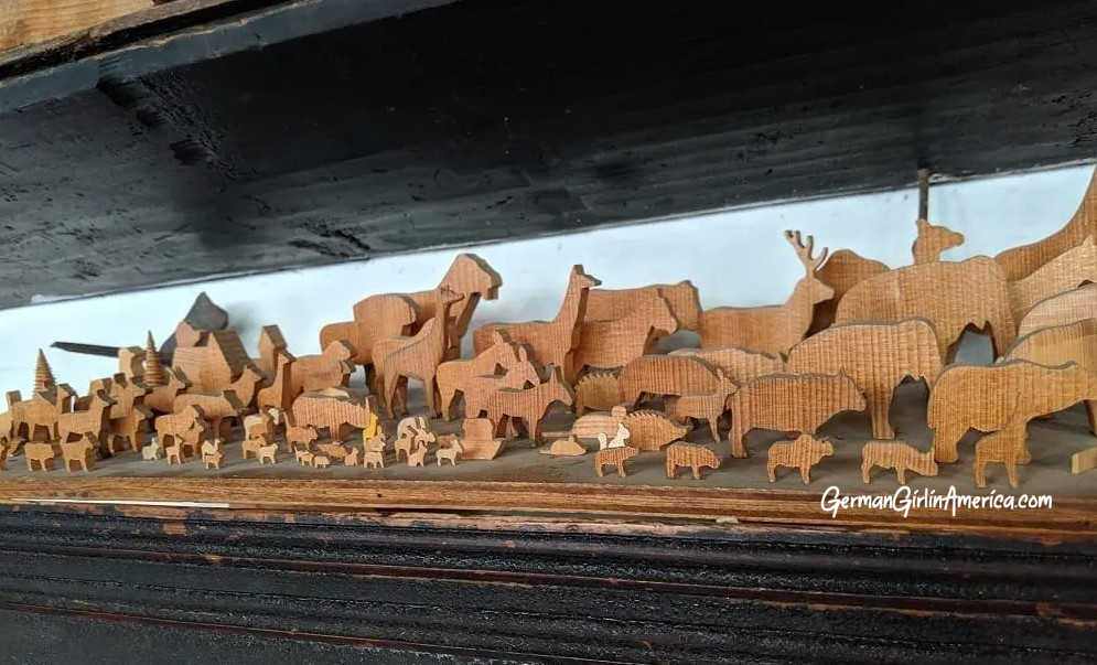 Making toys this way was literally a cottage industry. At the Freilicht Museum, we went inside the homes. One room was for “living” with a Kitchen/Table/Benches/Hearth, while the second room would be filled with racks of little figures waiting for paint and finishing. Some smaller homes only had one space. People ate and worked at the same table. The whole family was involved in toy manufacturing.