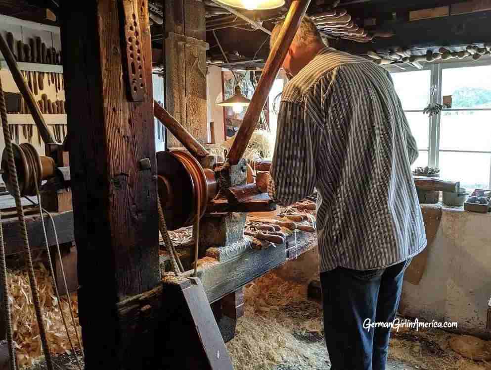 Before our trip to Seiffen, my friend Richard told me, “Do NOT MISS the Reifendrehen.” I was confused; what is Reifendrehen? Wheel turning? Do people in Seiffen watch wheels spinning? Reifendrehen is a special technique for making toys and other small objects known mainly to Seiffen and the surrounding area of the Erzgebirge. When the local mountains no longer produced enough Ore, locals switched to making wooden toys and ornaments using the woodworking skills and machines essential for mining. The same machines miners used to keep mines stable, remove water from the mine, and bring miners in and out of the mine were miniaturized and used to make Christmas Pyramids. They repurposed the lathe to carve large numbers of little toy figures. Around the world, Seiffen is known as the Spielzeugstadt (Toy Town). We were lucky enough to see the technique up close and done the old-fashioned way, at the Erzgebergische Freilicht Museum in Seiffen.