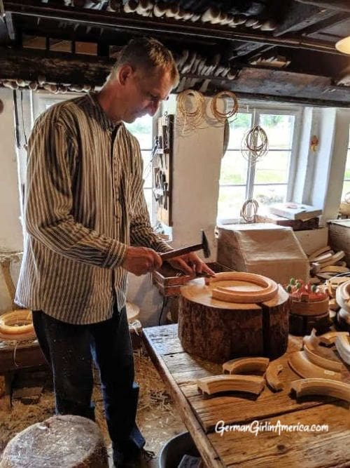 Sadly, the art of Reifendrehen may vanish. The Reifendreher at the Freilicht Museum is one of the few of these craftsmen left, and he doesn’t have an apprentice. Maybe it’s something a young woodworker can aspire to?