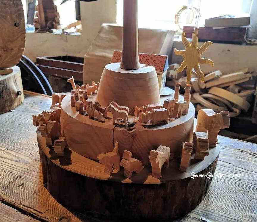 Using a lathe, craftsmen can take a disk of wood and, while it spins, carve away the unneeded parts and end up with a notched ring. Looking at the end, you can see the beginnings of the figure he’s making. Then the Reifendreher (wheel turner) slices pieces off like he’s slicing a cake, and before you stands a horse, a cow, a lamb, or even a giraffe. Finally, small toys could be “mass produced” quickly and efficiently. Selling in bulk could support a family. One man carving a single giraffe at a time could NEVER produce enough to make it worthwhile. But this lathe method of reifendrehen meant that dozens of figures could be produced at once. Then, the family would help smooth the edges and paint the figures.