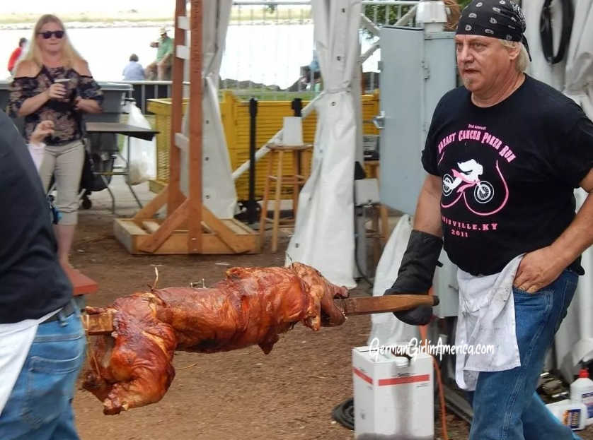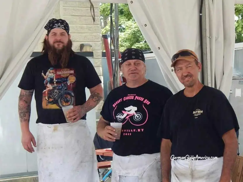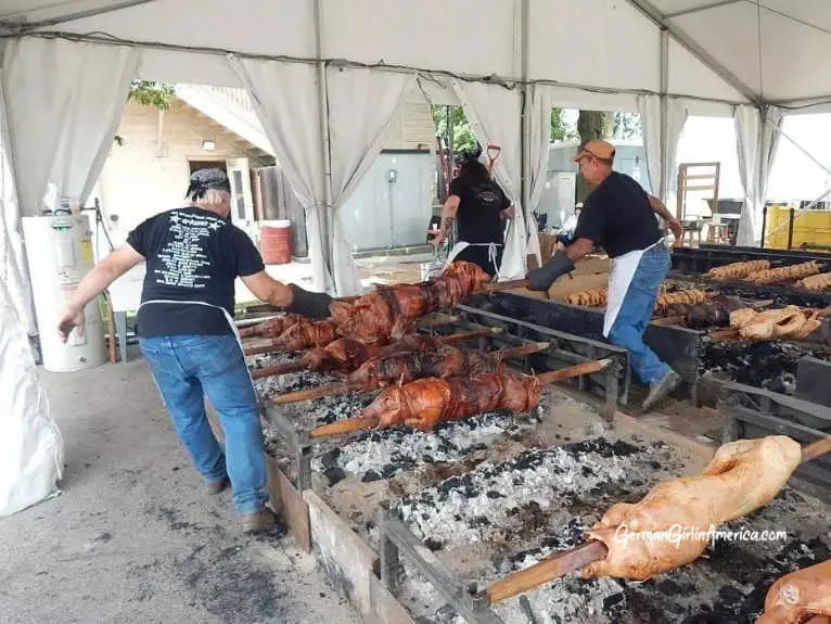 It’s at least a two-man job to load the pigs on the spit and then carry them to the kitchen for chopping once they are roasted. The three guys on the shift at German Fest will oversee the roasting of 55 pigs over the three days of the Festival. And it is a lot of hot and heavy work, but in the end, it’s worth it.