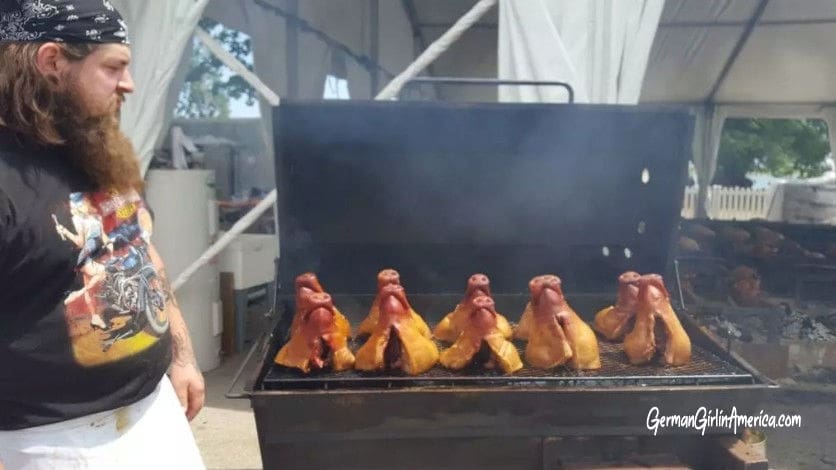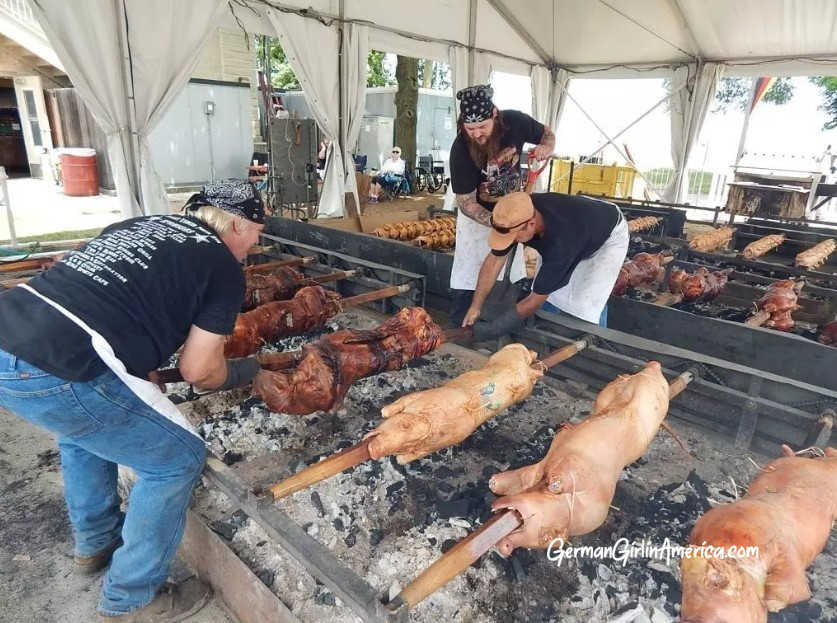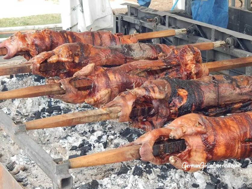 At big German Festivals and gatherings, you will often find Spanferkel on the menu. What is Spanferkel? A “Ferkel” is a little pig (it’s also what my mom would call me when I came home particularly muddy), and “Span” is wood chips. Pig in Wood Chips? That can’t be right. It was time to learn more. My introduction to Spanferkel came the first time I walked through the German Fest Grounds in Milwaukee. Right in the middle of everything was an area with pigs roasting on spits. A LOT of pigs. Slowly spinning and roasting. Now, I’ve been to big Bar B Ques, and I’ve been to Luaus, so the ‘whole pig’ thing was not new. But this was a serious LOT of pigs. We had to stop and talk to the guys at the pit, and tried it. WOW! Spanferkel is delicious!