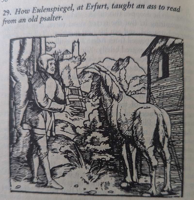 Till put up a notice at the University of Erfurt that he could teach anyone to read. The Lord of the University had heard of his previous tricks and thought they could best him. So they called him in and asked if he could teach a donkey to read. Till said he could, but it would take 20 years, and they must pay him 500 Groschen in advance. They did, thinking they would get the money back. He took the donkey to a private stall and put oats between the pages of a Psalter. The donkey learned to expect them and flipped the pages to look for them. When he couldn’t find the oats, he brayed “Eee-aaaa”. Till called the Rector in to show the donkey’s progress. When the hungry donkey couldn’t find oats between the pages, he called out “EEe-aaa“. Till explained, “See, he’s already learned two vowels, “e” and “a.” I’m sure he will learn more soon.” The Rector went away amazed, and Till took the money and left town.